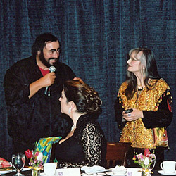 Looking back - I planted the seeds 20 years earlier. I was attending an opera - Katherine Ardo, Head of the Voice Care Foundation Canada, saw me wearing one of my silk creations. She approached me, asking: "Where did you buy this scarf?" "I made it myself", was my answer. Then - many years later - Katherine had the brilliant idea to bring world famous opera singer Luciano Pavarotti to Calgary for a rare concert - April 16, 2002. Luciano chose to grace the stage here.